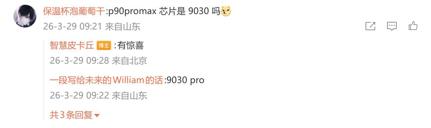 后续有用户在评论区询问:“p90promax 芯片是 9030 吗 [狗头斜眼]”,博主回复道:“有惊喜”;另一名用户则询问道:“超大大杯没有了嘛 [捂脸笑哭]”,博主则回复道:“pm”。