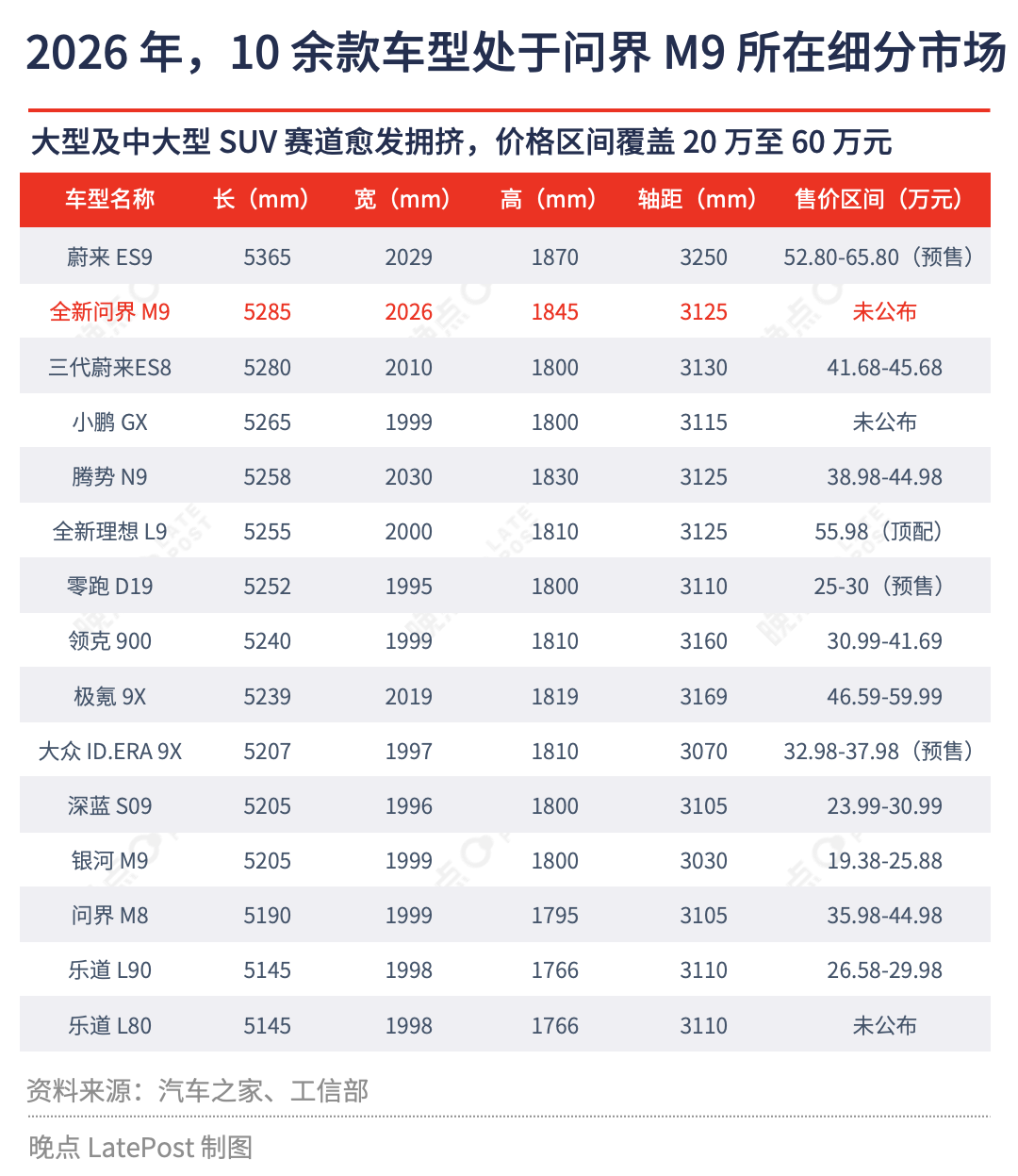 展望 2026 年,全新一代问界 M9 将面临前所未有的激烈竞争。据我们不完全统计,将有 10 余款车型与其同台竞技,价格区间覆盖 20 万至 60 万元。尽管竞争环境日趋激烈,但基于问界 M9 过往在销量、口碑等领域的表现,全新一代产品有望在市场表现与行业影响力层面呈现积极趋势。