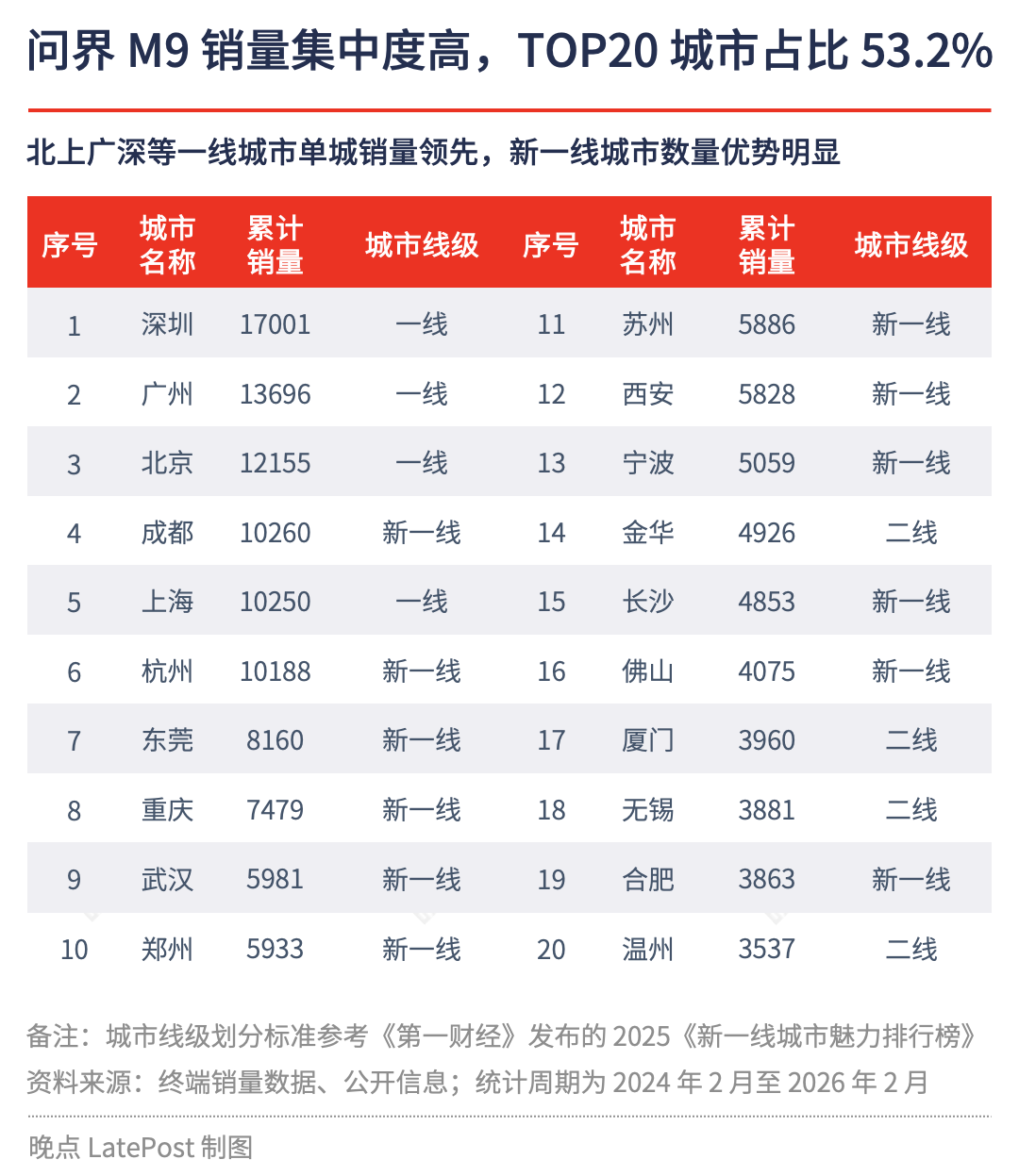 问界 M9 在高端消费市场的渗透程度令人瞩目。两年来,销量排名前二十城市的合计销量占比达 53.2%,这样的高集中度体现出问界 M9 在核心消费群体中的受欢迎程度。其中,深圳以 1.7 万辆的累计销量领跑全国,广州、北京等一线城市紧随其后;成都、杭州等新一线城市同样表现出强劲的购买力,单城累计销量过万。